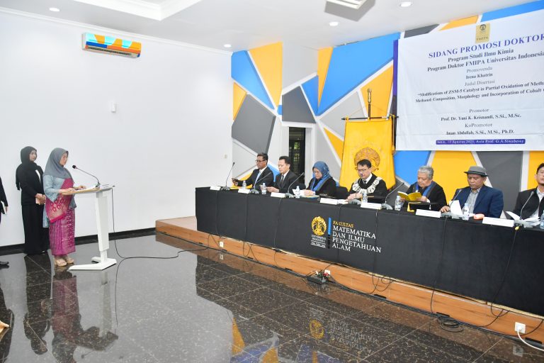 For her contribution, Irena earned a Doctorate in Chemistry from the Faculty of Mathematics and Natural Sciences, Universitas Indonesia (FMIPA UI), with cum laude distinction and a GPA of 3.83. The doctoral defense was held on Monday (August 11, 2025) at the Prof. Dr. G.A. Siwabessy Auditorium, UI Depok Campus, chaired directly by the Dean of FMIPA UI, Prof. Dede Djuhana, M.Si., Ph.D.