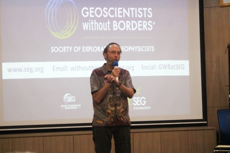 The event then continued with the main seminar session moderated by Anne Meylani Magdalena Sirait, Ph.D. In this session, Robert K. Merrill presented material on the role of geoscience in addressing various humanitarian challenges through the Geoscientists without Borders (GWB) program.