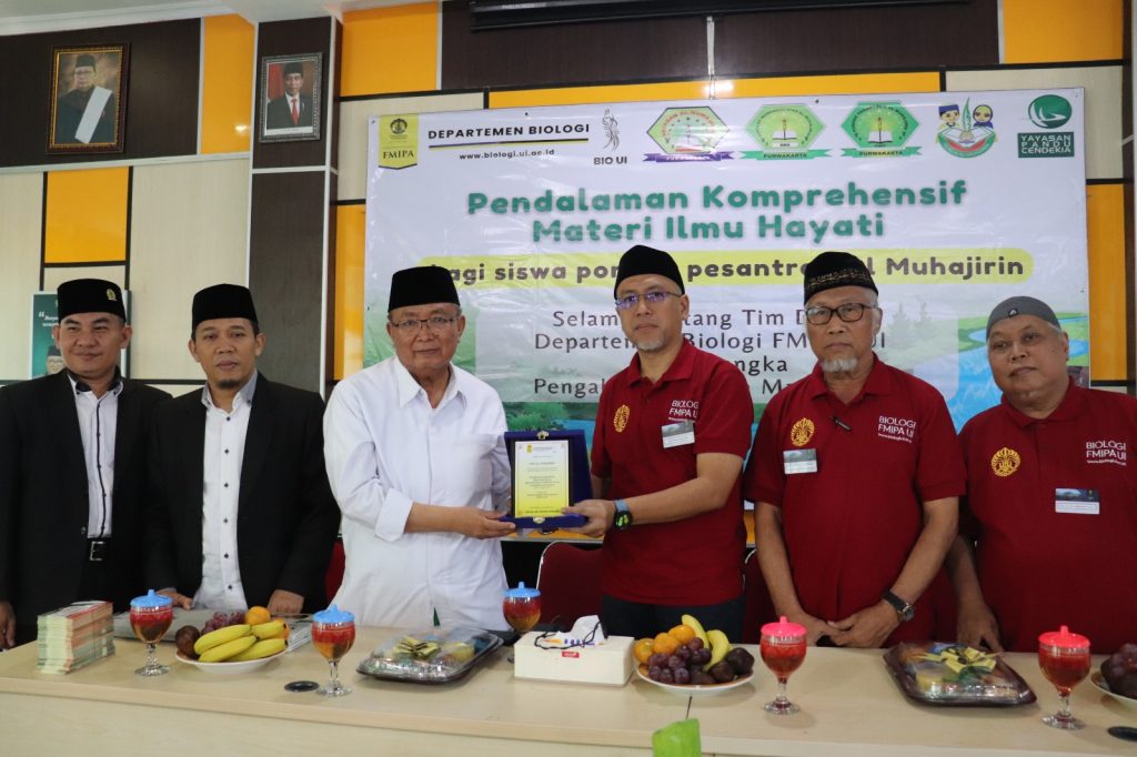 The head of the Al-Muhajirin Islamic Boarding School in Purwakarta, K.H. Dr. Abun Bunyamin, M.A., expressed his appreciation to the FMIPA UI team for organizing this activity. In his remarks, he also conveyed the importance of science for life, especially in the field of biology. According to him, science is a knowledge that contains signs of the greatness of Allah SWT, which provides many benefits for the survival of humanity.