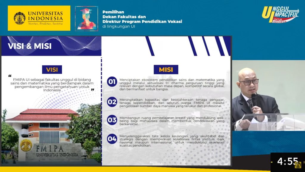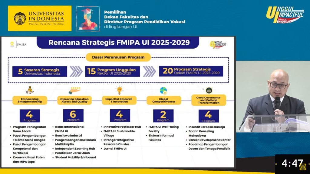 Pada sesi presentasi visi dan misi yang digelar pada Senin (24/11) di Gedung Science Techno Park UI, para kandidat memaparkan arah pengembangan fakultas di hadapan pimpinan UI dan para panelis. Dalam pemaparannya yang mengusung tagline Driven by Knowledge, Defined by Impact, Prof. Tito menghadirkan visi menjadikan FMIPA UI sebagai fakultas unggul di bidang sains dan matematika yang mampu memberikan kontribusi nyata bagi kemajuan ilmu pengetahuan di Indonesia melalui pendidikan berkualitas, riset inovatif, dan kolaborasi lintas disiplin. Visi tersebut kemudian diturunkan ke dalam 20 Program Strategis FMIPA UI 2025–2029, yang dirumuskan selaras dengan lima sasaran strategis UI serta 15 program unggulan Rektor UI 2025–2029, namun tetap berfokus pada kebutuhan dan potensi FMIPA UI sebagai pusat keunggulan sains nasional.