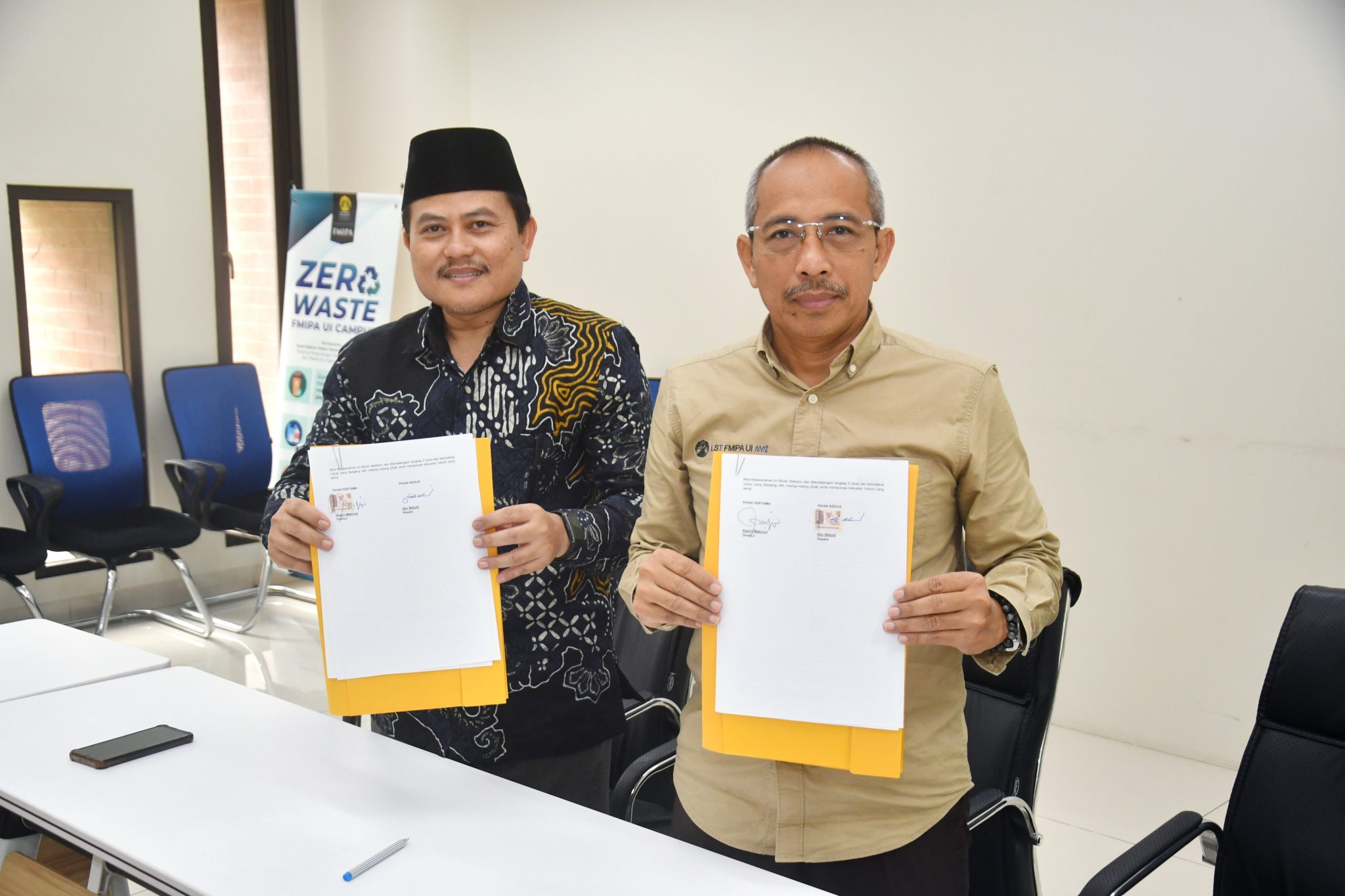 The signing ceremony of the Memorandum of Understanding was carried out by the Head of UKK LST FMIPA UI Eko Waludi, M.Sc. and KH. Khariri Makmun, Lc., M.A. Masyayikh Council and Caretaker of Algebra Bogor Islamic Boarding School, at the Multidisciplinary Research Laboratory Building FMIPA UI – PT Pertamina (Persero), UI Campus, Depok, on Friday (15/3/2024).