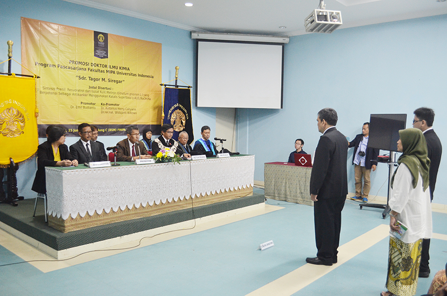 To award Tagor M. Siregar a Doctorate in Chemistry, the Faculty of Mathematics and Natural Sciences (FMIPA) of the University of Indonesia (UI) held an open doctoral promotion defense today, Wednesday, June 15, 2016. The event took place in Building C of the Faculty. The dissertation was titled “Synthesis of Prenyl Resveratrol from Melinjo (Gnetum gnemon L.) Peel Isolates with Anticancer Potential Using γ-Al2O3/NaOH/Na Superbasic Catalysis.”